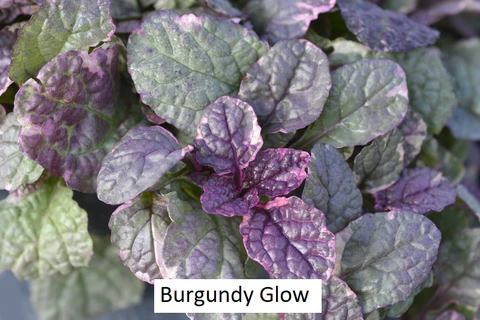 Ajuga reptans 'Burgundy Glow' features variegated leaves with shades of green, cream, and burgundy with blue-purple blooms.